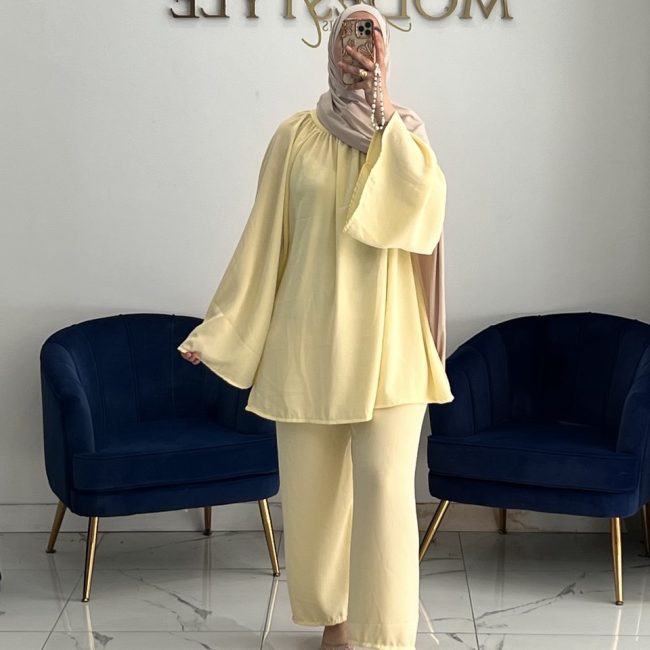 Les manches longues légèrement bouffantes, resserrées aux poignets, ajoutent une touche romantique et moderne. cette tenue incarne parfaitement la modestie chic et la féminité assumée.